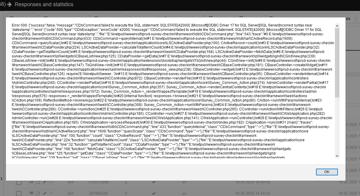 My opinoion : another issue, must be reported separatlymikecouchman wrote: Error 500: {"success":false,"message":"CDbCommand failed to execute the SQL statement: SQLSTATE[42000]: [Microsoft][ODBC Driver 17 for SQL Server][SQL Server]Incorrect syntax near 'datestamp'.","error"