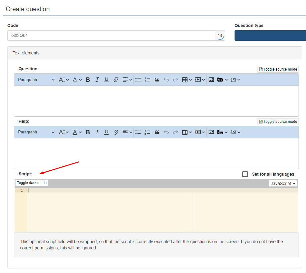 However, you can also just include your Javascript into the field for the question itself, if you include it in the source mode of the WYISWYG-Editor or switch the Editor off (which I generally do).