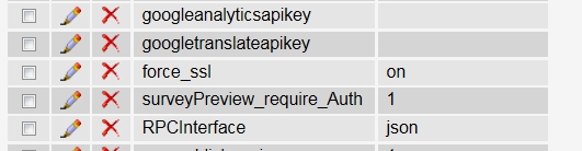 // LimeSurvey developers: Set this to 2 to additionally display STRICT PHP error messages and get full access to standard templates'ssl_emergency_override'=>true,'ssl_disable_alert'=>true,'debug'=>0,'debugsql'=>0,// Set this to 1 to enanble sql logging, only active when debug = 2
