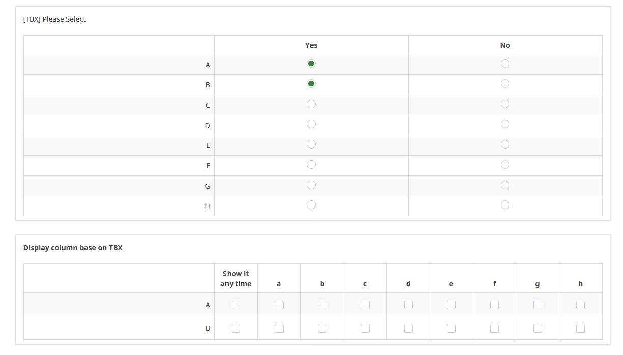 If I selected A and B in the previous question, the followup question will show A and B for both row and column. (Hide C-H)