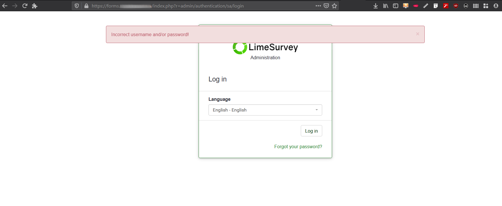 I have been using Limesurvey for some years now and it is the first time I got such a trouble. Limesurvey doesn't show username nor password inputs on admin login page. It asks for language to chose first and then throws an error "Incorrect username and/or password!"