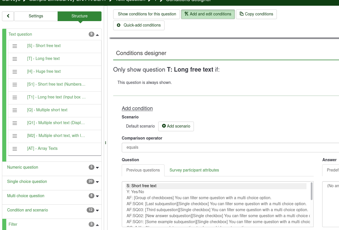 (Recently after upgradation we face in condition designing.On condition designing only all privious questions should be shown which happened earlier.Now all previous questions are not showing as well next questions are are showing.All are showing in sequency disorderWrite here your question/remark. Screenshot attached for condition design for Questiuon no-4)