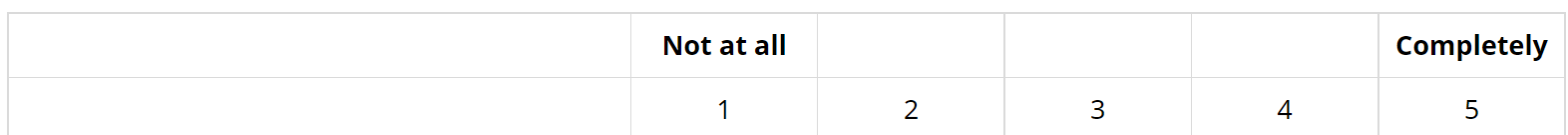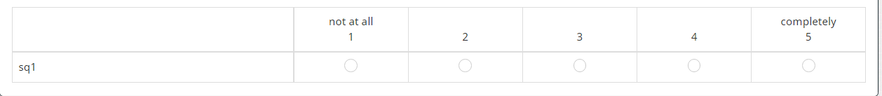 <script type="text/javascript" charset="utf-8"> $(document).on('ready pjax:scriptcomplete',function(){ // Insert the column categories $('#question{QID} table.subquestion-list thead tr:eq(0) td:eq(0)').remove(); $('#question{QID} table.subquestion-list thead').prepend('<tr class="ls-heading">\ <td rowspan="2" colspan="1" style="border-top:0 !important;"></td>\ <th class="answer-text inserted-header" colspan="1">not at all</th>\ <th class="answer-text inserted-header" colspan="1"></th>\ <th class="answer-text inserted-header" colspan="1"></th>\ <th class="answer-text inserted-header" colspan="1"></th>\ <th class="answer-text inserted-header" colspan="1">completely</th>\ </tr>'); }); </script>