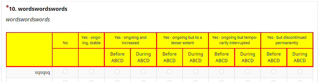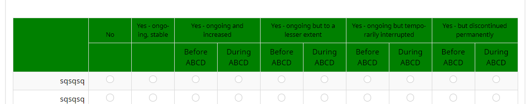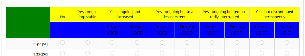 <style type="text/css"> /* the left empty square */ ls-heading td { background-color:green; } /* the default header */ ls-heading th { background-color:blue; } /* the inserted header */ ls-heading th.inserted-header { background-color:yellow; } </style>