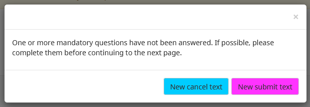<script type="text/javascript" data-author="Tony Partner"> $(document).on('ready pjax:scriptcomplete',function(){ // Identify some elements var modalSubmitBtn = $('#mandatory-soft-alert-box-modal'); var mandatoryModal = $(modalSubmitBtn).closest('.modal'); var modalCancelBtn = $('a[data-bs-dismiss="modal"]', mandatoryModal); var modalBody = $('.modal-body', mandatoryModal); // Add some classnames so we can style the modal mandatoryModal.addClass('soft-mandatory-modal'); modalSubmitBtn.addClass('soft-mandatory-modal-submit'); modalCancelBtn.addClass('soft-mandatory-modal-cancel'); // Move the buttons modalSubmitBtn.before(modalCancelBtn); // Submit button text modalSubmitBtn.text('New submit text'); // Cancel button text modalCancelBtn.text('New cancel text'); }); </script>
