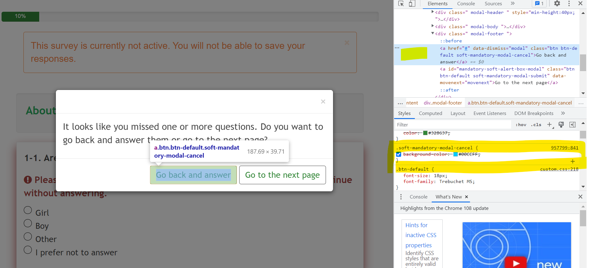 <style type="text/css" data-author="Tony Partner"> .soft-mandatory-modal-submit { background-color: #FF33FF } .soft-mandatory-modal-cancel { background-color: #00CCFF; } </style>