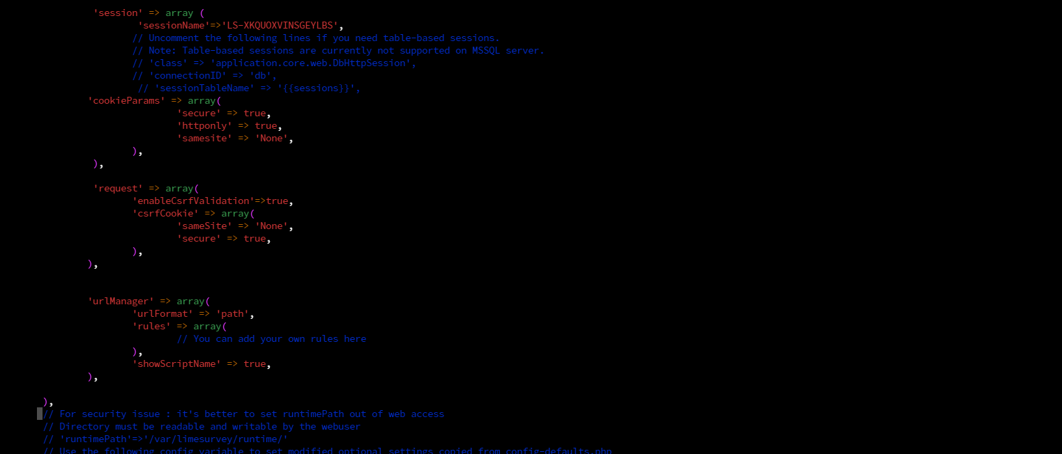 'session' => array ( 'sessionName' => "SPDemo", //~ 'class' => 'application.core.web.DbHttpSession', //~ 'connectionID' => 'db', //~ 'sessionTableName' => '{{sessions}}', 'cookieParams' => array( 'secure' => true, 'httponly' => true, 'samesite' => 'None', ), ), 'request' => array( 'enableCsrfValidation'=>true, 'csrfCookie' => array( 'sameSite' => 'None', 'secure' => true, ), ),