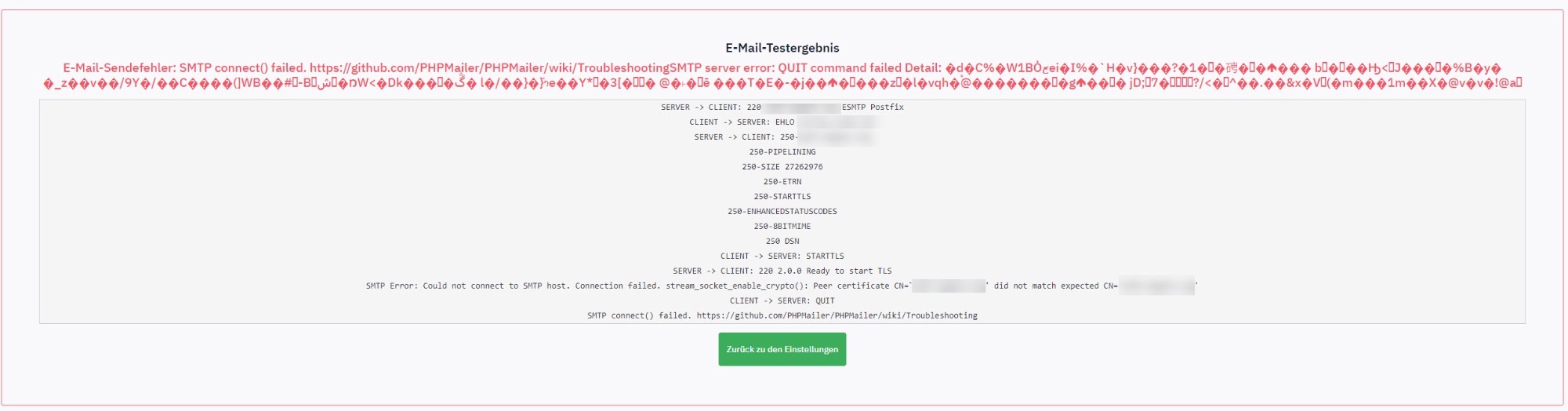 CDbCommand konnte das SQL-Statement nicht ausführen: SQLSTATE[HY000]: General error: 1366 Incorrect string value: '\xFA\xC4<\x18BN...' for column 'error_message' at row 1. The SQL statement executed was: INSERT INTO `lime_failed_emails` (`language`, `status`, `recipient`, `surveyid`, `responseid`, `email_type`, `error_message`, `created`, `updated`, `resend_vars`) VALUES (:yp0, :yp1, :yp2, :yp3, :yp4, :yp5, :yp6, NOW(), :yp7, :yp8)