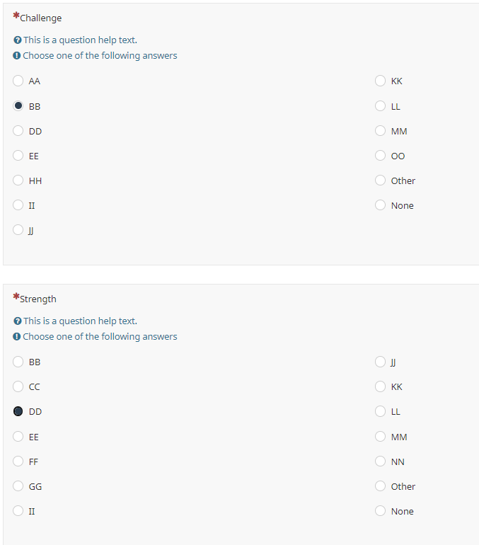Sorry, I do not understand.which is also a list (radio) question where the respondent can select the biggest strength. I have added the table below for reference. What I require is an Array filter exclusion for only answers shown in the biggest challenge question and the biggest strength question that are the same.