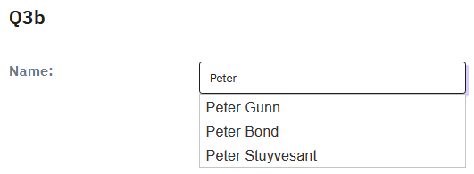 $(document).on('ready pjax:complete',function() { $('#question{QID} input[type="text"]').autocomplete({ minLength: 5, source: [ "Peter Gunn", "Alfred Miller", "Peter Bond", "Alice Miller", "Peter Stuyvesant", "Carol King" ] }); }); </script>