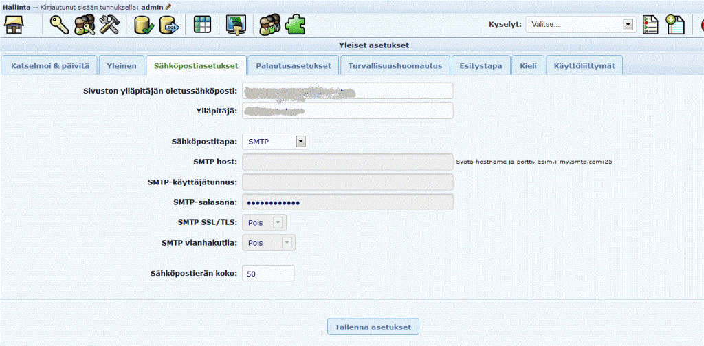 I went to global confoguration and saw the disappeared setting. The setting is SMTP, but still the fileds are grayed. I attached a screen shot of that page (in Finnish