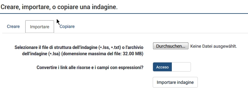 Purtroppo non riesco. Nella mia pagina non c'è l'opzione "importare", ma solo "crea"... Ma non è grave.Joffm wrote: Il terzo allegato è un esempio. Dovresti importarlo come nuovo indagine. (lss = Limesurvey survey)