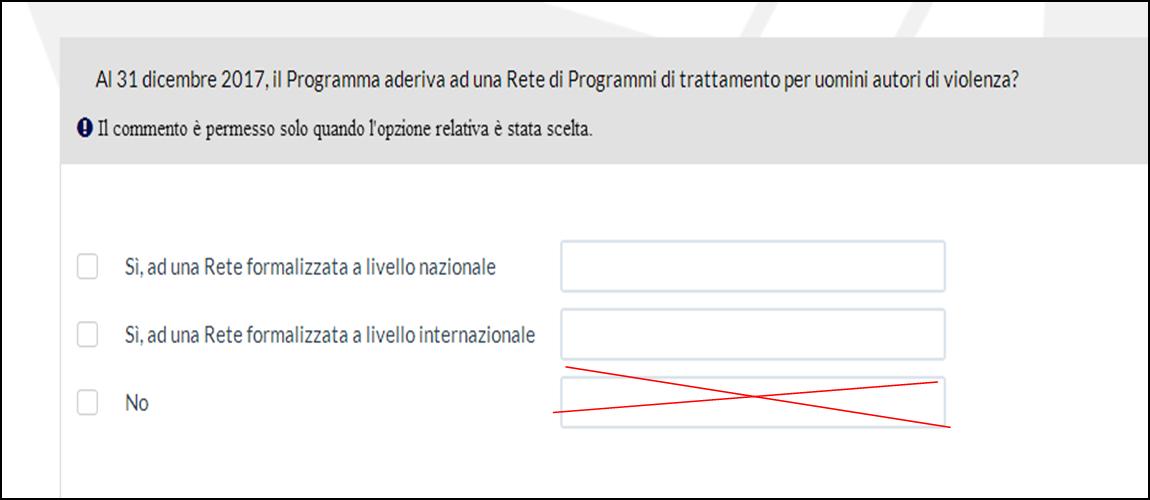 Code:<script type="text/javascript" charset="utf-8"> $(document).ready(function() { var q1ID = 68; var msg = 'Please specify in the comment box.'; // Hide the first 3 text inputs of Q1 $('#question'+q1ID+' li[id^="javatbd"]:eq(0) .comment').hide(); $('#question'+q1ID+' li[id^="javatbd"]:eq(1) .comment').hide(); $('#question'+q1ID+' li[id^="javatbd"]:eq(2) .comment').hide(); // Interrupt next/submit function $('#movenextbtn, #movesubmitbtn').click(function(){ // Reset some stuff var failedMandatory = 0; $('#question'+q1ID+' input.text').css({ 'background':'' }); // Loop through all check answers in Q1 $('#question'+q1ID+' input.checkbox:checked').each(function(i){ // Define the row var thisRow = $(this).parents('li:eq(0)'); // Check for empty mandatory text inputs if($('input.text:visible', thisRow).length > 0 && $('input.text', thisRow).val() == '') { $('input.text', thisRow).css({ 'background':'pink' }); failedMandatory = 1; } }); // Abort submit if any mandatory text inputs are empty if(failedMandatory == 1) { alert (msg); return false; } else { return true; } }); }); </script>