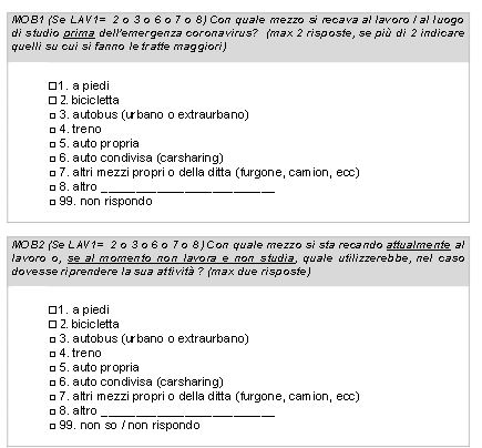 In pratica MOB3 mi deve comparire se alla domanda MOB1 è stato selezionato "autobus" o "treno" E alla domanda MOB2 ogni altra opzione che non sia "autobus" o "treno".