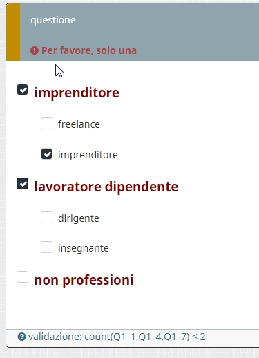 <script type="text/javascript" charset="utf-8"> // A function to handle "secondary" checkboxes function secondaryCheckboxes(qID, primaryPosition, secondaryCount) { // Identify the elements var thisQuestion = $('#question'+qID); var primaryRow = $('li.question-item:eq('+(primaryPosition-1)+')', thisQuestion).closest('li.question-item'); var primaryInput = $('input:checkbox', primaryRow); var secondaryRows = primaryRow.nextAll('li.question-item:lt('+(secondaryCount)+')'); var secondaryInputs = $('input:checkbox', secondaryRows); // Indent the secondaries secondaryRows.css({ 'margin-left':'2.5em' }); // Initial states of the secondary answers if (primaryInput.prop('checked') == false ) { secondaryRows.hide(); } // A listener on the primary answer to show or hide secondary answers primaryInput.on('change', function (event) { // Hide/show the secondary answers accordingly if (!$(this).is(':checked')) { secondaryRows.hide(); secondaryInputs.prop('checked', false).trigger('change'); } else { secondaryRows.show(); } }); } $(document).ready(function() { // Sub-question 1 is primary followed by 2 secondaries secondaryCheckboxes({QID}, 1, 2); // Sub-question 4 is primary followed by 2 secondaries secondaryCheckboxes({QID}, 4, 2); // Sub-question 7 is primary followed by 2 secondaries secondaryCheckboxes({QID}, 7, 2); }); </script>