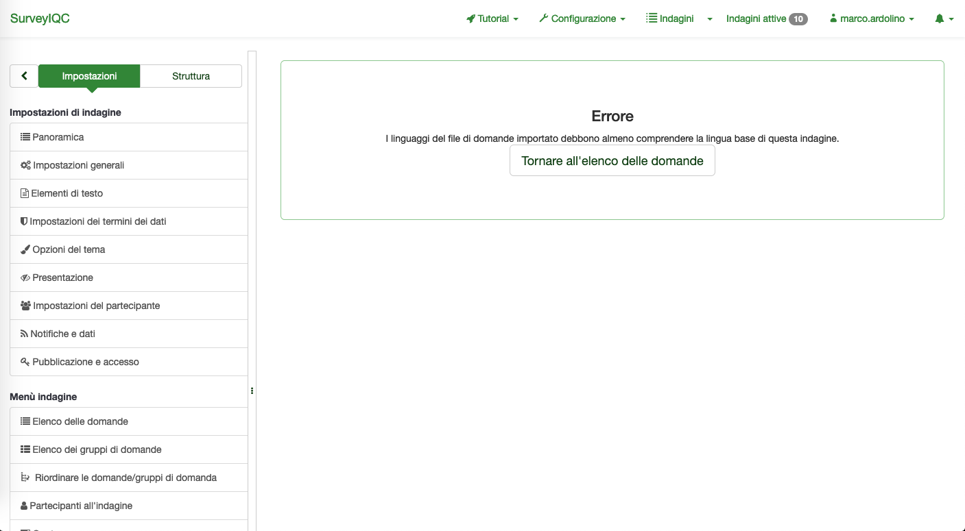 A giudicare dal messaggio di errore sembra che tu stia importando una domanda (file .lsq). Per importare una survey intera in formato lss devi andare su Crea Nuova Indagine e cercare il pulsante Importa.