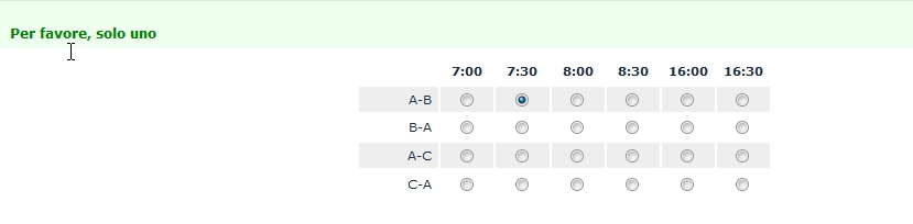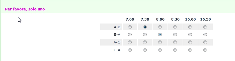 Ad esempio, se il mio utente sceglie Ciamarra-Einaudi alle 7.45 non può scegliere nessuno degli altri orari per Ciamarra-Einaudi ma nemmeno orari per le altre righe.