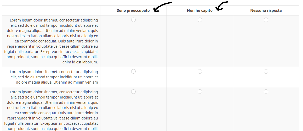 Potresti suddividere la tua domanda array in tante domande tipo "scelta semplice", e a quel punto hai l possibilità di impostare un tema personalizzato che consente di mostrare le emoticons al posto dei radio-buttons, anche compatibili con i device mobili. Ma non puoi mettere insieme emoticons e testo. Magari ti fai le immagini inserendo in basso il testo, se proprio ti serve.