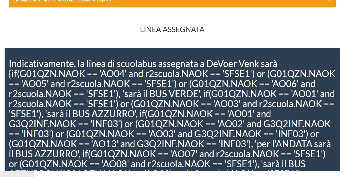 {G03Q70=if(((G01QZN.NAOK == 'AO04') and (r2scuola.NAOK == 'SFSE1')) or ((G01QZN.NAOK == 'AO05') and (r2scuola.NAOK == 'SFSE1')) or ((G01QZN.NAOK == 'AO06') and (r2scuola.NAOK == 'SFSE1'))), "sarà il BUS VERDE",(((G01QZN.NAOK == 'AO01') and (r2scuola.NAOK == 'SFSE1')) or ((G01QZN.NAOK == 'AO03') and (r2scuola.NAOK == 'SFSE1'))), "sarà il BUS AZZURRO",(((G01QZN.NAOK == 'AO01') and (G3Q2INF.NAOK == 'INF03')) or ((G01QZN.NAOK == 'AO02') and (G3Q2INF.NAOK == 'INF03')) or ((G01QZN.NAOK == 'AO03') and (G3Q2INF.NAOK == 'INF03')) or ((G01QZN.NAOK == 'AO13') and (G3Q2INF.NAOK == 'INF03'))), "per l'ANDATA sarà il BUS AZZURRO",(((G01QZN.NAOK == 'AO07') and (r2scuola.NAOK == 'SFSE1')) or ((G01QZN.NAOK == 'AO08') and (r2scuola.NAOK == 'SFSE1'))), "sarà il BUS AZZURRO", (((G01QZN.NAOK == 'AO09') and (r2scuola.NAOK == 'SFSE1')) or ((G01QZN.NAOK == 'AO10') and (r2scuola.NAOK == 'SFSE1'))), "sarà il BUS ROSA", ((G01QZN.NAOK == 'AO05') and (G3Q2INF.NAOK == 'INF03')), "per l'ANDATA sarà il BUS ROSA", (((G01QZN.NAOK == 'AO06') and (G3Q2INF.NAOK == 'INF03')) or ((G01QZN.NAOK == 'AO12') and (G3Q2INF.NAOK == 'INF03'))), "per l'ANDATA sarà il BUS VERDE", (((G01QZN.NAOK == 'AO07') and (G3Q2INF.NAOK == 'INF03')) or ((G01QZN.NAOK == 'AO08') and (G3Q2INF.NAOK == 'INF03'))), "per l'ANDATA sarà il BUS ARANCIONE", (((G01QZN.NAOK == 'AO09') and (G3Q2INF.NAOK == 'INF03')) or ((G01QZN.NAOK == 'AO10') and (G3Q2INF.NAOK == 'INF03'))), "per il RITORNO sarà il BUS NAVETTA", (((G01QZN.NAOK == 'AO09') and (G3Q2INF.NAOK == 'INF03')) or ((G01QZN.NAOK == 'AO10') and (G3Q2INF.NAOK == 'INF03'))), "per l'ANDATA sarà il BUS NAVETTA", (((G01QZN.NAOK == 'AO01') and (G3Q2INF.NAOK == 'INF03')) or ((G01QZN.NAOK == 'AO02') and (G3Q2INF.NAOK == 'INF03')) or ((G01QZN.NAOK == 'AO03') and (G3Q2INF.NAOK == 'INF03')) or ((G01QZN.NAOK == 'AO04') and (G3Q2INF.NAOK == 'INF03')) or ((G01QZN.NAOK == 'AO05') and (G3Q2INF.NAOK == 'INF03'))), "per il RITORNO sarà il BUS VERDE", ((G01QZN.NAOK == 'AO06') and (G3Q2INF.NAOK == 'INF03')), "per il RITORNO sarà il BUS AZZURRO", (((G01QZN.NAOK == 'AO07') and (G3Q2INF.NAOK == 'INF03')) or ((G01QZN.NAOK == 'AO08') and (G3Q2INF.NAOK == 'INF03')) or ((G01QZN.NAOK == 'AO11') and (G3Q2INF.NAOK == 'INF03'))), "per il RITORNO sarà il BUS AZZURRO", (((G01QZN.NAOK == 'AO01') and (G3Q2INF.NAOK == 'INF03')) or ((G01QZN.NAOK == 'AO02') and (G3Q2INF.NAOK == 'INF03')) or ((G01QZN.NAOK == 'AO03') and (G3Q2INF.NAOK == 'INF03')) or ((G01QZN.NAOK == 'AO04') and (G3Q2INF.NAOK == 'INF03')) or ((G01QZN.NAOK == 'AO05') and (G3Q2INF.NAOK == 'INF03')) or ((G01QZN.NAOK == 'AO12') and (G3Q2INF.NAOK == 'INF03'))), "per il RITORNO POMERIDIANO sarà il BUS AZZURRO", ((G01QZN.NAOK == 'AO06') and (G3Q2INF.NAOK == 'INF03')), "per il RITORNO POMERIDIANO sarà il BUS VERDE", (((G01QZN.NAOK == 'AO11') and (G3Q2INF.NAOK == 'INF03')) or ((G01QZN.NAOK == 'AO07') and (G3Q2INF.NAOK == 'INF03')) or ((G01QZN.NAOK == 'AO08') and (G3Q2INF.NAOK == 'INF03'))), "per il RITORNO POMERIDIANO sarà il BUS AZZURRO", (((G01QZN.NAOK == 'AO09') and (G3Q2INF.NAOK == 'INF03')) or ((G01QZN.NAOK == 'AO10') and (G3Q2INF.NAOK == 'INF03'))), "per il RITORNO POMERIDIANO sarà il BUS ROSA", "FARE RIFERIMENTO AL SITO MOM PER SAPERE LA LINEA DA UTILIZZARE"}