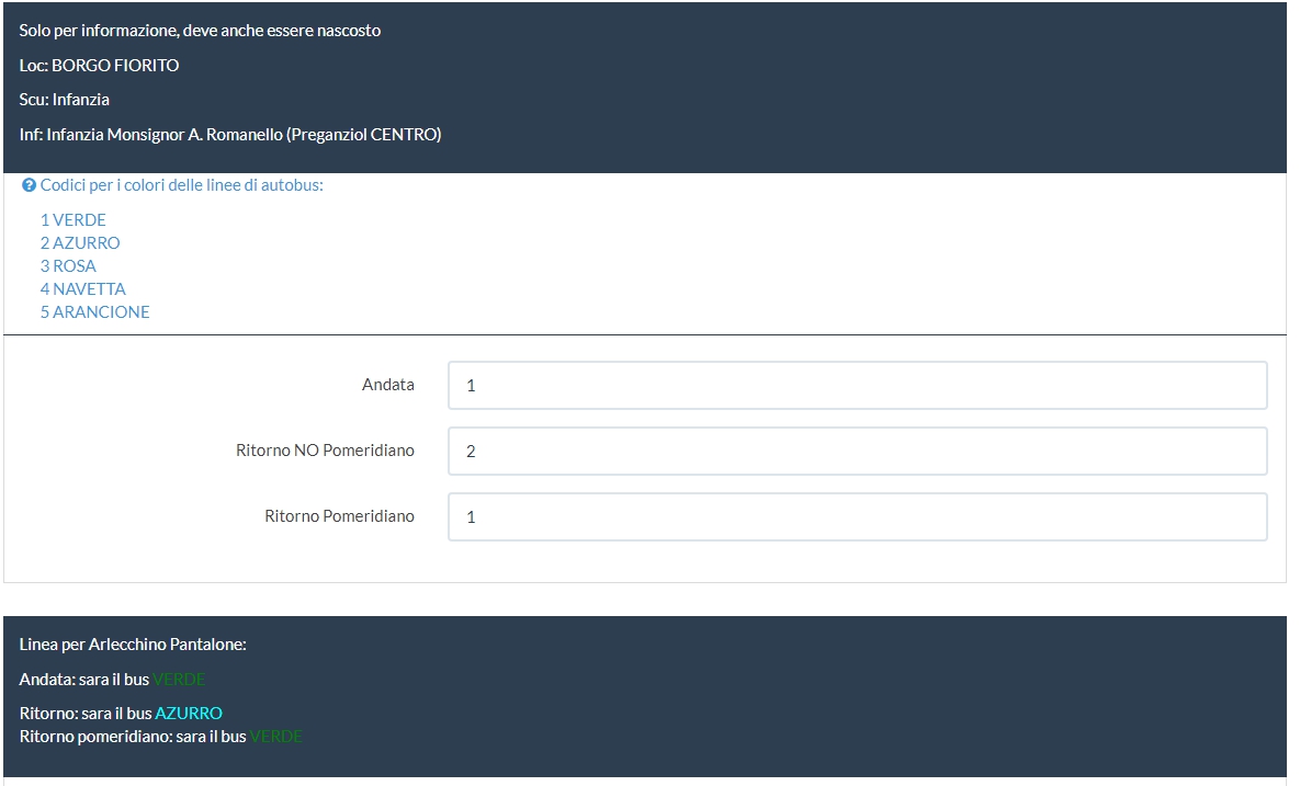Data la zona del paese (G01QZN) e la scuola frequentata (r2scuola.NAOK == 'SFSE1' oppure G3Q2INF.NAOK == 'INF03' ecc.) viene fuori la linea assegnata.