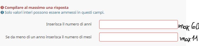 Se sono alternative ti conviene prima chiedere se è più o meno di un anno e poi metti due domande una per gli anni e una per i mesi, ovviamente mostri una delle due in base alla scelta della domanda precedente