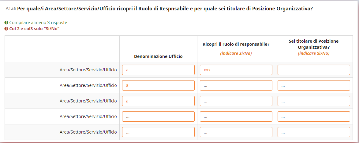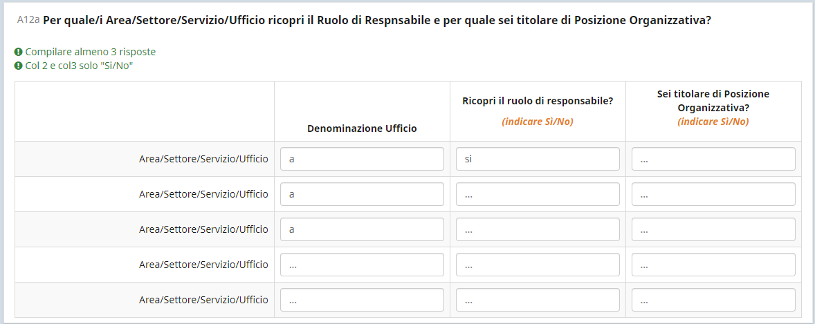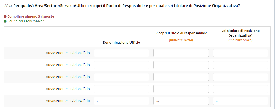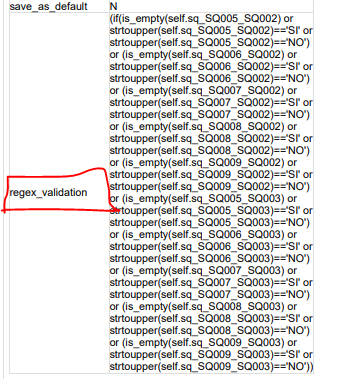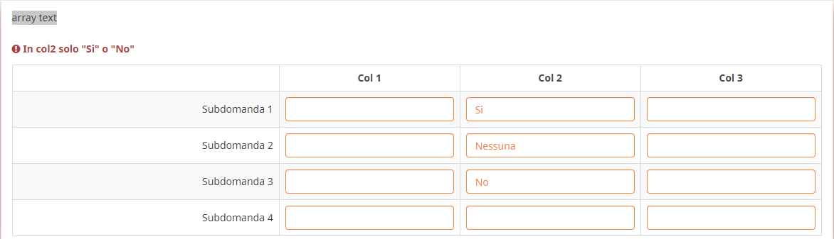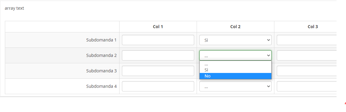 <script type="text/javascript" charset="utf-8"> $(document).on('ready pjax:scriptcomplete',function(){ var thisQuestion = $('#question{QID}'); // Add a question class thisQuestion.addClass('custom-array'); // Column-specific classes $('table.subquestion-list tr', thisQuestion).each(function(i) { $('th, td', this).each(function(i) { $(this).addClass('column-'+i); }); }); // Insert selects $('.answer-item.answer_cell_X002', thisQuestion).addClass('with-select').append('<select class="inserted-select form-control list-question-select">\ <option value="">...</option>\ <option value="1">Si</option>\ <option value="2">No</option>\ </select>'); // Listeners $('.inserted-select', thisQuestion).on('change', function(i) { if($(this).val() != '') { $(this).closest('.answer-item').find('input:text').val($('option:selected', this).val()).trigger('change'); } else { $(this).closest('.answer-item').find('input:text').val('').trigger('change'); } }); // Returning to page $('.with-select input:text', thisQuestion).each(function(i) { var thisCell = $(this).closest('.answer-item'); var inputText = $.trim($(this).val()); $('select.inserted-select', thisCell).val(inputText); }); // Clean-up styles $('select.inserted-select', thisQuestion).css({ 'max-width': '100%' }); $('.with-select input:text', thisQuestion).css({ 'position': 'absolute', 'left': '-9999em' }); }); </script>