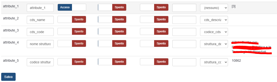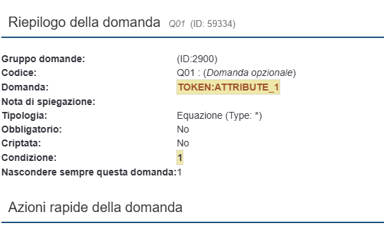 devo utilizzare dei dati registrati nel CMDB e per fare questo utilizzo la gestione dei campi attributoattribute_1 (nessuno) anno_corso cds_descrizione codice_cds codice_fiscale struttura_codice struttura_descrizione tipologia_utente_principale tipologia_utente_secondaria alternative_email [3]attribute_2 (nessuno) anno_corso cds_descrizione codice_cds codice_fiscale struttura_codice struttura_descrizione tipologia_utente_principale tipologia_utente_secondaria alternative_email attribute_3 (nessuno) anno_corso cds_descrizione codice_cds codice_fiscale struttura_codice struttura_descrizione tipologia_utente_principale tipologia_utente_secondaria alternative_email attribute_4 (nessuno) anno_corso cds_descrizione codice_cds codice_fiscale struttura_codice struttura_descrizione tipologia_utente_principale tipologia_utente_secondaria alternative_email xxxxxxxxattribute_5 (nessuno) anno_corso cds_descrizione codice_cds codice_fiscale struttura_codice struttura_descrizione tipologia_utente_principale tipologia_utente_secondaria alternative_email abc Nelle domande di tipo "equazione" inserisco il valore dell'attributo {TOKEN:ATTRIBUTE_1} {TOKEN:ATTRIBUTE_2} etc etc Codice:Q01 : (Domanda opzionale)Domanda:TOKEN:ATTRIBUTE_1Nota di spiegazione:Tipologia:Equazione (Type: *)Obbligatorio:NoCriptata:NoCondizione:1 Non riesco a capire il motivo, ma il sistema non inietta nella domanda il valore dell'attributo. Qualcuno mi può dare dei suggerimenti?