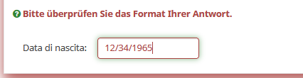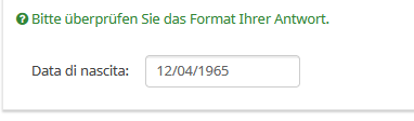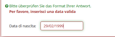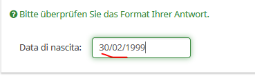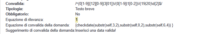 RegExp: /^(0[1-9]|[12][0-9]|3[01])\/(0[1-9]|1[0-2])\/(19|20)\d{2}$/Invece c'è un modo per validare una domanda testuale nel formato DD/MM/AAAA.