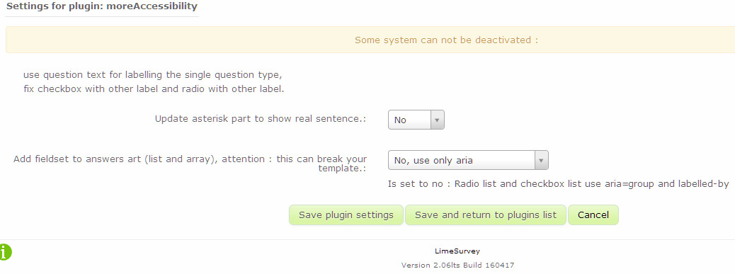I think 2.5X must not be used for accessibility. It's the reason why i completly rewrite all HTML fror develop/3.0 version, see tinyurl.com/z4fjkt2 , and about label : bugs.limesurvey.org/view.php?id=11449cortxdp wrote: I've been testing the 2.5x version without your plugin and I notice the extensive use of aria attributes instead of native tag and attributes. .....