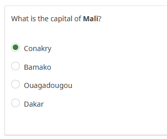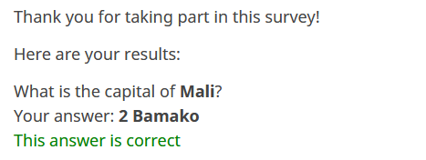 Thank you for taking part in this survey! Here are your results: {Q1.question} Your answer: {Q1}: {Q1.shown} {if(Q1==2,'This answer is correct','This answer is wrong. The correct answer is "Bamako"')}