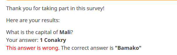 Thank you for taking part in this survey! Here are your results: {Q1.question} Your answer: {Q1}: {Q1.shown} {if(Q1==2,'This answer is correct','This answer is wrong. The correct answer is "Bamako"')}