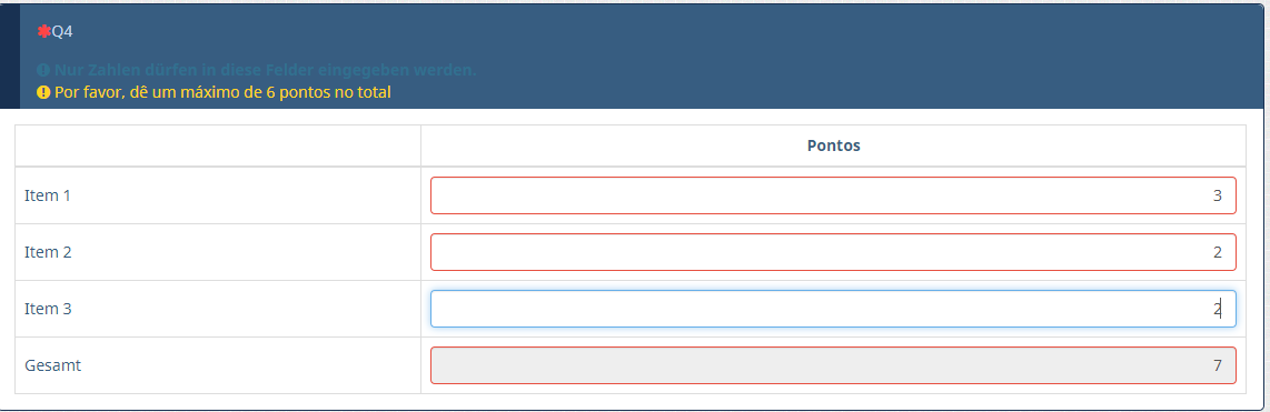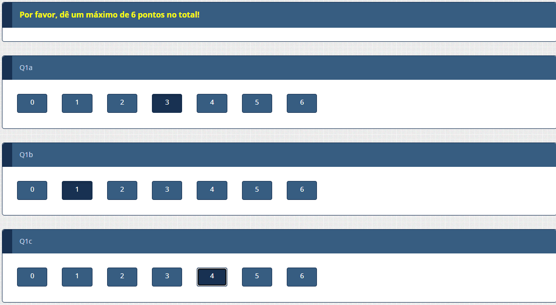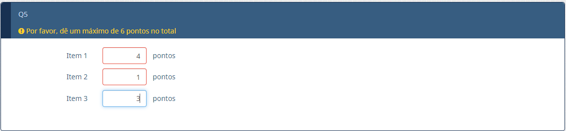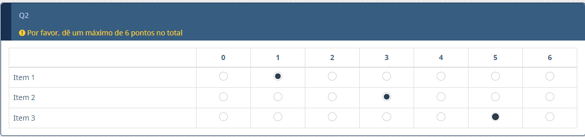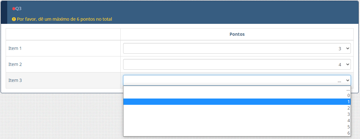 Qual melhor formato de questão para distribuição de pontos? Preciso distribuir 6 pontos para avaliar 3 itens. Por exemplo: