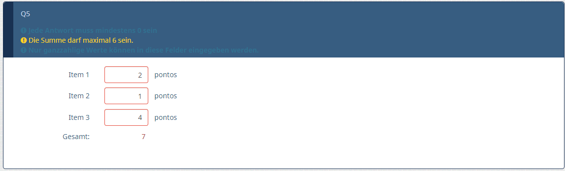 O total somando os 3 não pode ultrapassar 6, então se o item1 ganhar 2 pontos, restará apenas 4 pontos para serem distribuídos entre os outros  2 itens.