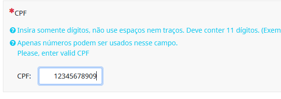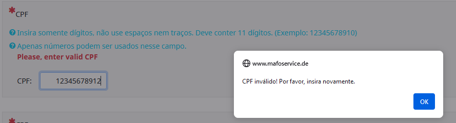<script type="text/javascript" charset="utf-8"> $(document).ready(function () { $('#question{QID} input[type="text"]').keyup(function(){ var cpf=$('#question{QID} input[type="text"]').val(); if(cpf.length==11) { if (!isCPFValido(cpf)) { alert("CPF inválido! Por favor, insira novamente."); $('#question{QID} input[type="text"]').val(""); // Limpa o campo } } }); }); function isCPFValido(cpf) { // Remove caracteres não numéricos cpf = cpf.replace(/\D/g, ""); // ???? // Verifica se o CPF tem 11 dígitos e não é formado por números repetidos if (cpf.length !== 11 || /^(\d)\1+$/.test(cpf)) { return false; } // Calcula o primeiro e o segundo dígito verificador const calcDigito = (base) => { const soma = base.reduce((acc, num, i) => acc + num * (base.length + 1 - i), 0); const resto = soma % 11; return resto < 2 ? 0 : 11 - resto; }; const nums = cpf.split("").map(Number); const digito1 = calcDigito(nums.slice(0, 9)); const digito2 = calcDigito(nums.slice(0, 10)); // Verifica se os dígitos verificadores estão corretos return digito1 === nums[9] && digito2 === nums[10]; } </script>