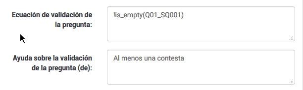 Claro, que puedes adaptar por dos contestas: (!is_empty(Q01_SQ001) AND (!is_empty(Q01_SQ002)