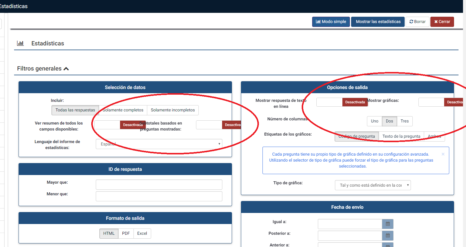 tengo varios problemas con las estadísticas en Modo experto en mi Limesurvey.