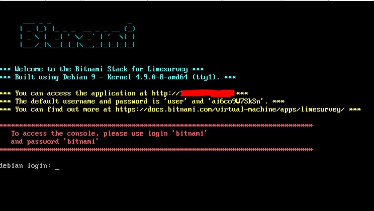 2º: Eso no es la administración de Limesurvey. Eso es de Bitnami. Entonces entra en contacto con Bitnami si tienes problemas con eso. Limesurvey es una aplicación web, eso es una tela de Linux.