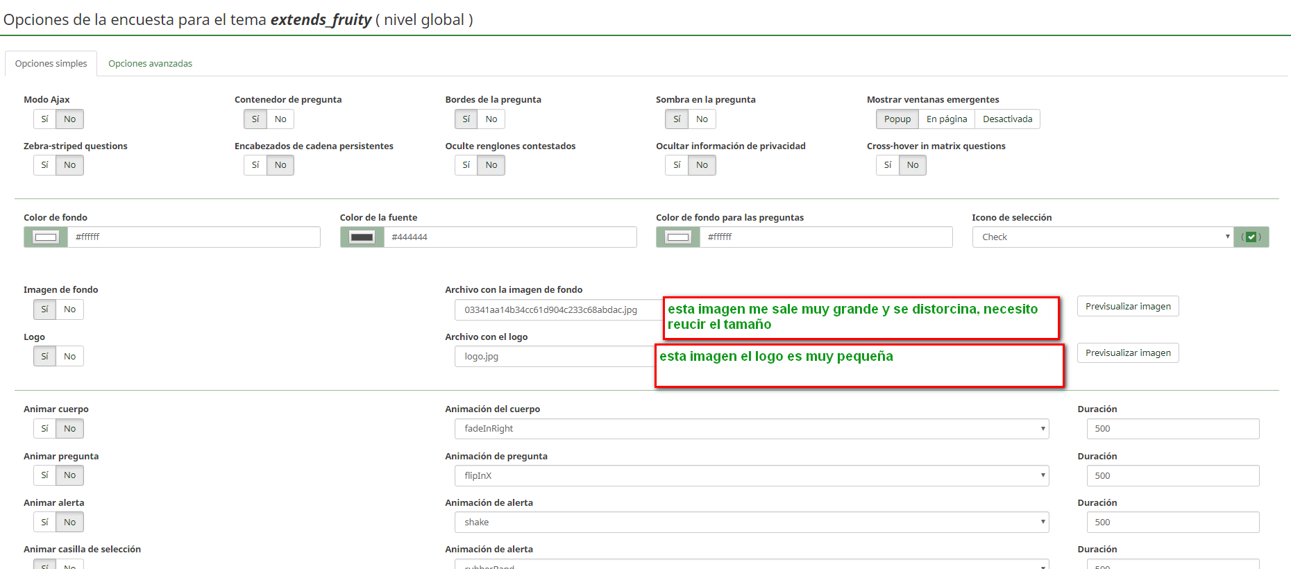 solicito me colabores con la informacion o el paso a paso de como reducir o ampliar las imagenes de fondo y mi logo personar de mis encuentas en limesurvey.