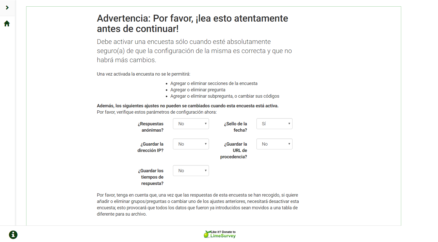 Estoy intentando activar una encuesta. Clico en el botón verde de activar y me aparece la pantalla con el siguiente contenido: