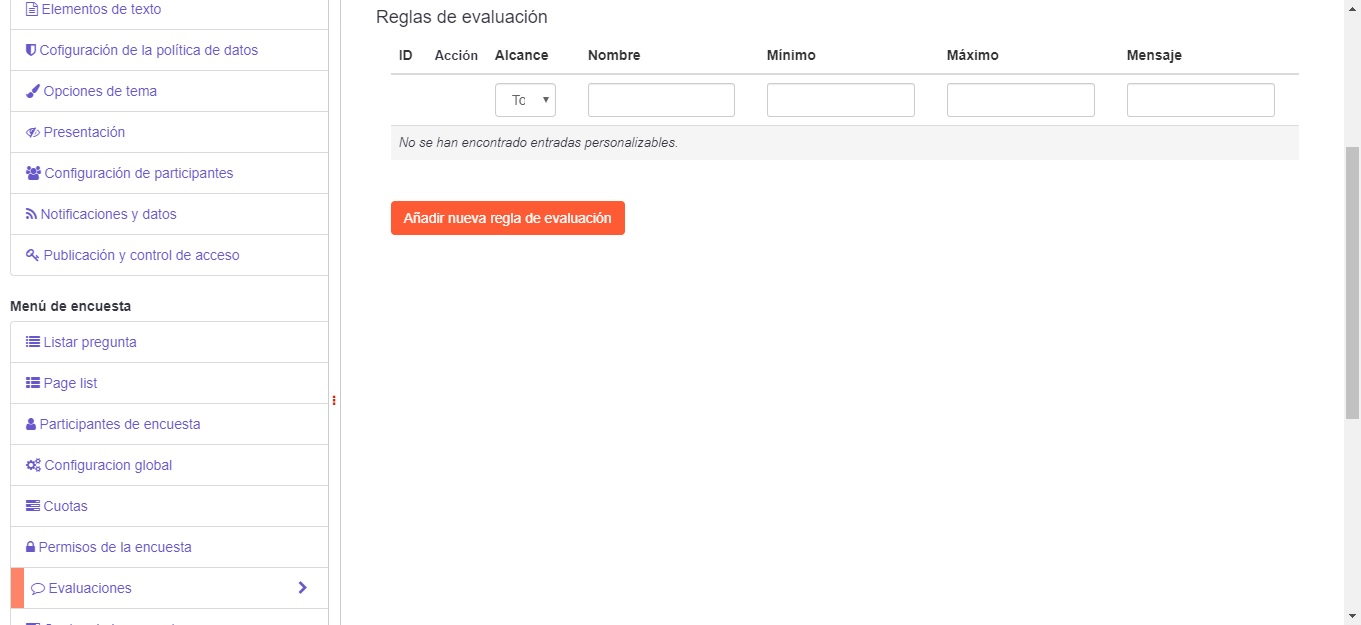 Necesito realizar una encuesta en la cual pueda realizar la evaluación de las respuestas de los usuarios. Eh visto y seguido el video de assessment, y al querer crear una nueva regla de evaluación no me lo permite. Esto me sucedió antes y después de realizar la última actualización de LS, eh borrado la caché del navegador y eh intentado con otros navegadores y nada me funciona. Necesito de su ayuda para saber cómo puedo agregar nuevas reglas y en general cómo hacer una encuesta en la que pueda realizar las evaluaciones.
