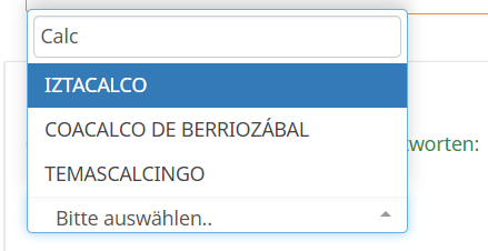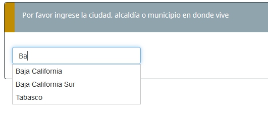 <link rel="stylesheet" type="text/css" href="/lime3/upload/surveys/355411/css/jquery-ui.min.css" /> <script type="text/javascript" src="/lime3/upload/surveys/355411/files/jquery-ui.min.js" ></script> <script type="text/javascript" charset="utf-8"> $(document).on('ready pjax:complete',function() { $('#question{QID} input[type="text"]').autocomplete({ minLength: 2, source: ["AZCAPOTZALCO", "COYOACÁN", "CUAJIMALPA DE MORELOS", "GUSTAVO A. MADERO", "IZTACALCO", "IZTAPALAPA", "LA MAGDALENA CONTRERAS", "MILPA ALTA", "O' TLÁHUAC","TLALPAN","XOCHIMILCO","BENITO JUÁREZ","CUAUHTÉMOC","MIGUEL HIDALGO","VENUSTIANO CARRANZA","ACAMBAY DE RUÍZ CASTAÑEDA","ACULCO","ALUOL", "ALMOLOYA DE JUÁREZ", "ALMOLOYA DEL RÍO", "AMANALCO", "AMATEPEC", "AMECAMECA", "APAXCO", "ATENCO", "ATIZAPÁN", "ATIZAPÁN DE ZARAGOZA", "ATLACOMULCO", "AXAPUSCO", "AYAPANGO", "CALIMAYA", "CAPULHUAC", "COACALCO DE BERRIOZÁBAL", "COATEPEC HARINAS", "COCOTITLÁN", "COYOTEPEC", "CUAUTITLÁN", "CHALCO", "CHUCO", "CHAPULTEPEC", "CHIAUTLA", "CHICOLOAPAN", "CHICONCUAC", "CHIMALHUACÁN", "DONATO GUERRA", "ECATEPEC DE MORELOS", "ECATZINGO", "HUEHUETOCA", "HUEIXPOILA", "HUEIXPOILX","IXTAPALUCA","IXTAPAN DE LA SAL","IXTAPAN DEL ORO","IXTLAHUACA","XALATLACO","JALTENCO","JILOTEPING","JIQUIPILCO","JOCOTITLÁN","JOQUICING", "JUCHITEPEC", "LERMA", "MALINALCO", "M. ELCHOR OCAMPO","METEPEC","MEXICALTZINGO","MORELOS","NAUCALPAN DE JUÁREZ","NEZAHUALCÓYOTL","NEXTLALPAN","NICOLÁS ROMERO","NOPALTEPEC","OCOYOACAC","OTUMBA","OTZOLOAPAN","OTZOLOTEPEC","OZUMBA","PAPALOTLA","LA PAZ","POLOTITLÁN","RAYÓN","SAN ANTONIO LA ISLA","SAN FELIPE DEL PROGRESO","SAN MARTÍN DE LAS PIRÁMIDES","SAN MATEO ATENCO","SAN SIMÓN DE GUERRERO","SANTO TOMÁS","SOYANIQUILPAN DE JUÁREZ","SULTEPEC","TECÁMAC","TEJUPILCO","TEMAM", "TEMASCALCINGO", "TEMASCALTEPEC", "TEMOAYA", "TENANCINGO", "TENANGO DEL AIRE", "TENANGO DEL VALLE", "TEOLOYUCAN", "TEOTIHUACÁN", "TEPETLAOXTOC", "TEPETLAOXTOC","TEQUIXQUIAC","TEXCALTITLÁN","TEXCALYACAC","TEXCOCO","TEZOYUCA","TIANGUISTENCO","TIMILPAN","TLALMANALCO","TLALNEPANTLA DE BAZ","TLATLAYA","TOLCA","TULTEPEC","TULTITLÁN","VALLE DE BRAVO","VILLA DE ALLENDE","VILLA DEL CARBÓN","VILLA GUERRERO","VILLA VICTORIA","XONACATLÁN","ZACAZONAPAN","ZACUZONAPAN","ZACAZONAPAN", "ZUMPAHUACÁN", "ZUMPANGO", "CUAUTITLÁN IZCAL LI","VALLE DE CHALCO SOLIDARIDAD","LUVIANOS","SAN JOSÉ DEL RINCÓN","TONANITLA"] }); }); </script>