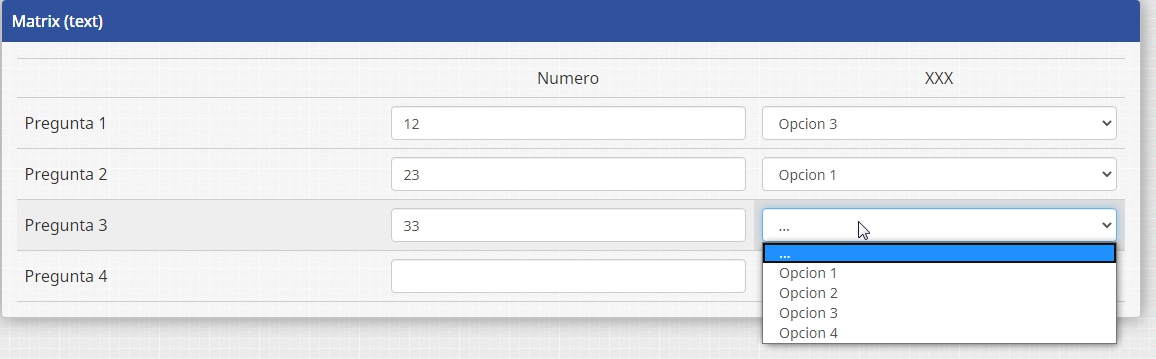 <script type="text/javascript" charset="utf-8"> $(document).on('ready pjax:scriptcomplete',function(){ var thisQuestion = $('#question{QID}'); // Insert selects $('.answer-item.answer_cell_X002', thisQuestion).addClass('with-select').append('<select class="inserted-select form-control list-question-select">\ <option value="">...</option>\ <option value="1">Opcion 1</option>\ <option value="2">Opcion 2</option>\ <option value="3">Opcion 3</option>\ <option value="4">Opcion 4</option>\ </select>'); // Listeners $('.inserted-select', thisQuestion).on('change', function(i) { if($(this).val() != '') { $(this).closest('.answer-item').find('input:text').val($.trim($('option:selected', this).text())).trigger('change'); } else { $(this).closest('.answer-item').find('input:text').val('').trigger('change'); } }); // Returning to page $('.with-select input:text', thisQuestion).each(function(i) { var thisCell = $(this).closest('.answer-item'); var inputText = $.trim($(this).val()); var selectval = $('select.inserted-select option', thisCell).filter(function () { return $(this).html() == inputText; }).val(); $('select.inserted-select', thisCell).val(selectval); }); // Clean-up styles $('select.inserted-select', thisQuestion).css({ 'max-width': '100%' }); $('.with-select input:text', thisQuestion).css({ 'position': 'absolute', 'left': '-9999em' }); }); </script>