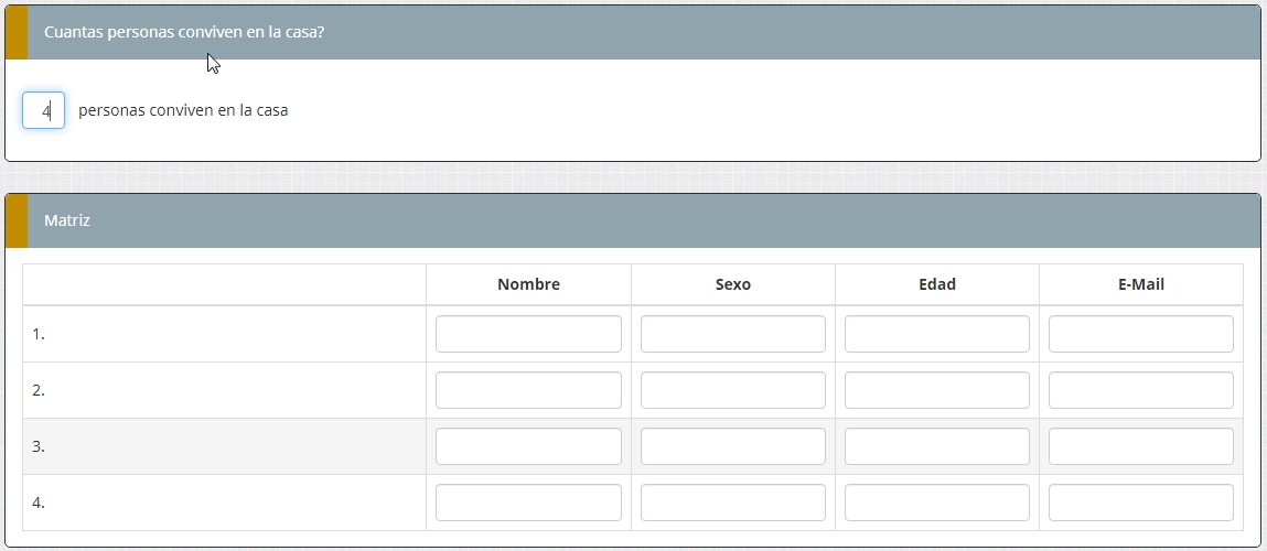 Cuantas personas conviven en la casa(pregunta numérica), y a partir de esa respuesta que se cree una matriz segun la cantidad de personas que viven en la casa, en la matriz preguntaría los datos de las personas(nombre, email, etc..)