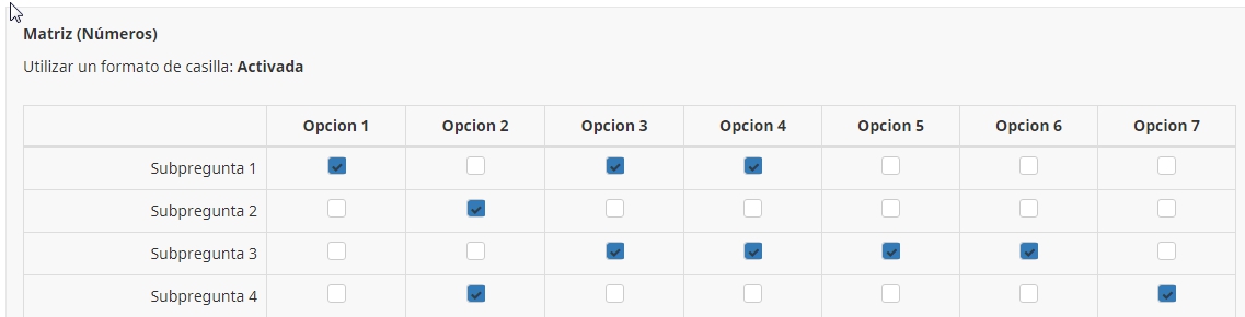 Necesito hacer una pregunta con respuestas múltiples pero referida a tres supuestos; esto es, una matriz con x filas (respuestas posibles) y x columnas (supuestos para los que quiero elegir 1 o varias de las respuestas posibles). Podrían indicarme si es posible. La solución que he visto es repetir la pregunta con sus repuestas para cada uno de los supuestos pero eso alarga demasiado el cuestionario.