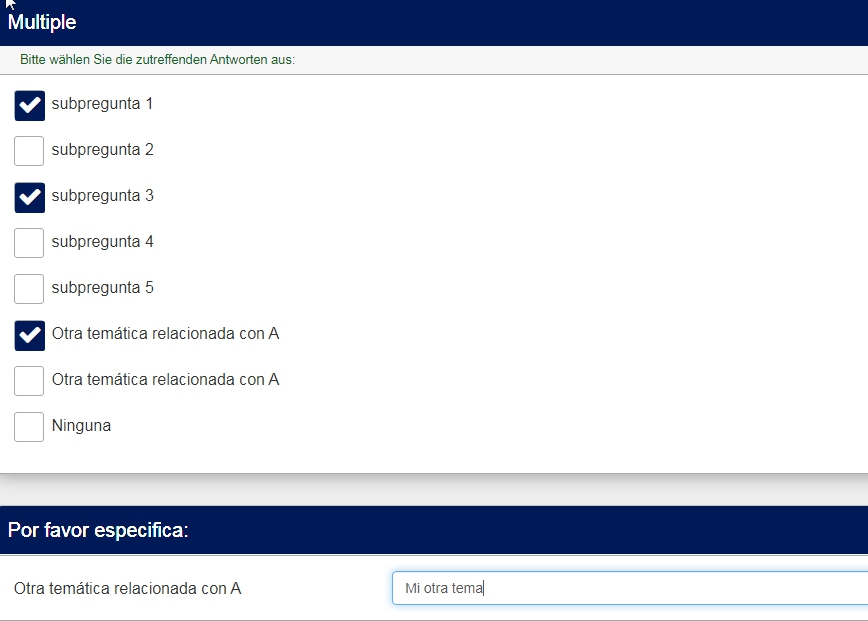 En una pregunta de opción múltiple, se puede introducir más de una respuesta de Otros (especificar). Se trata de especificar la opción otros en temáticas diferentes.