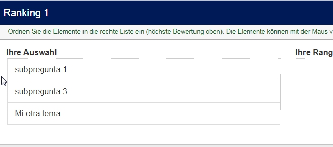 Con respecto a la inclusión de un espacio para introducir una nueva opción del usuario en una pregunta ranking, no se si he entendido muy bien la solución que propones ya que presentas dos preguntas ranking pero no se cómo/donde el usuario puede introducir la nueva opción.