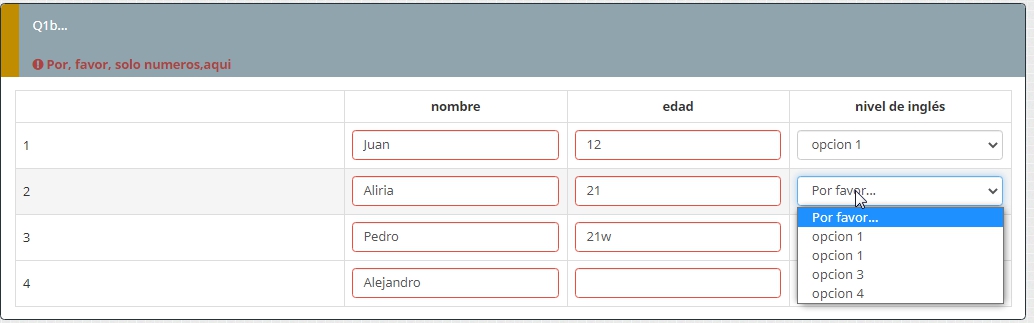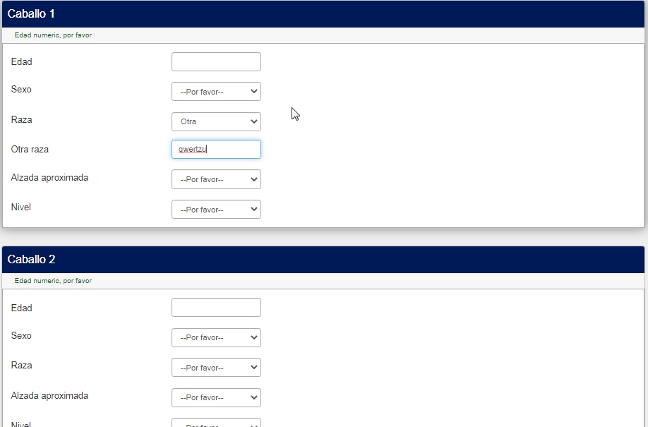 Edad, sexo (desplegable), Raza (desplegable + input), Alzada aproximada (desplegable), Nivel (desplegable), qué número de caballos que compiten se lesionaron (numérico)