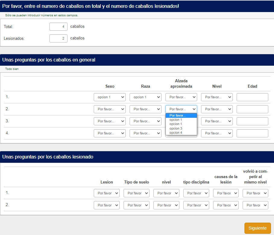 En realidad es una encuesta a jinetes. Hay que preguntarles con cuántos caballos compiten y, posteriormente, una serie de preguntas por cada caballo: