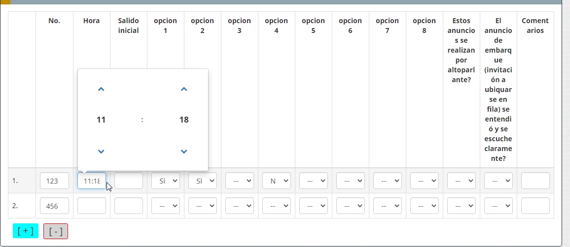 Hola, estoy en búsqueda de como poder hacer una matriz donde la persona que contesta pueda responder colocando la hora en una columna y en otras marcando el campo multiple, tambien colocando "si o no" y un comentario alfinal