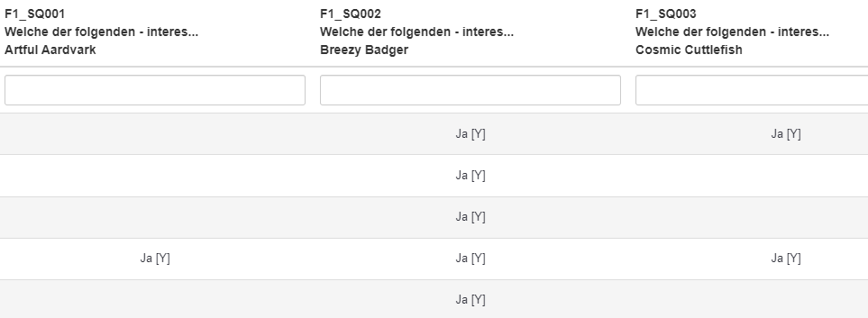 En la tabla de respuestas de LimeSurvey, puede ver que cada subpregunta se guarda como una pregunta con las opciones "Y" = seleccionado o "" = no seleccionado.